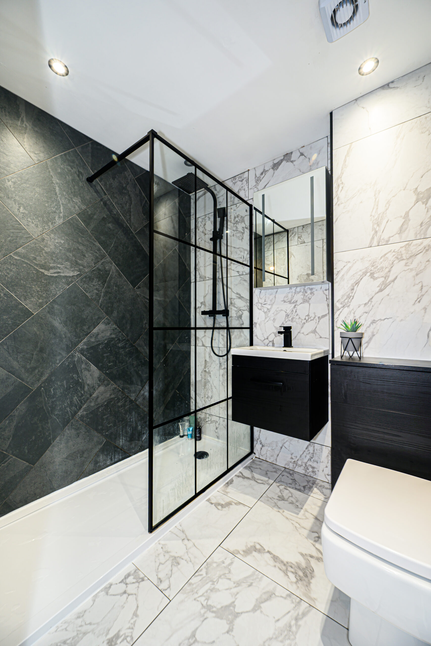 Recently renovated with marble-effect tiles, large walk-in shower, WC, and wash basin.