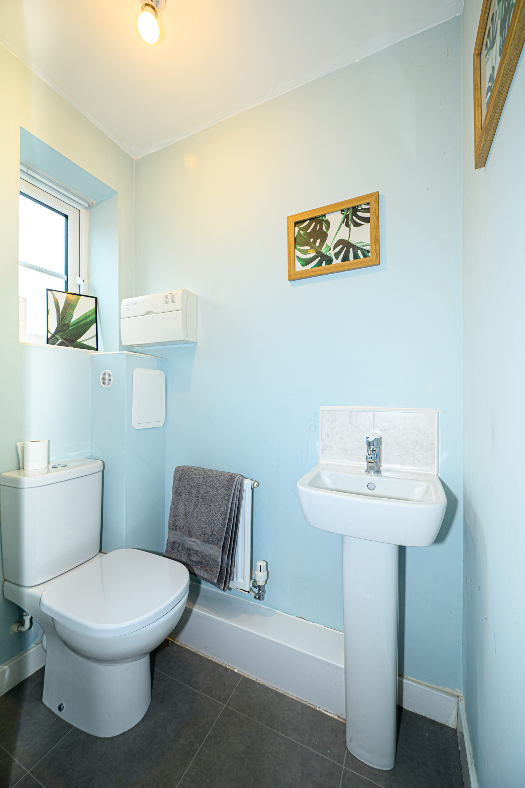 Convenient cloakroom with toilet and wash basin.