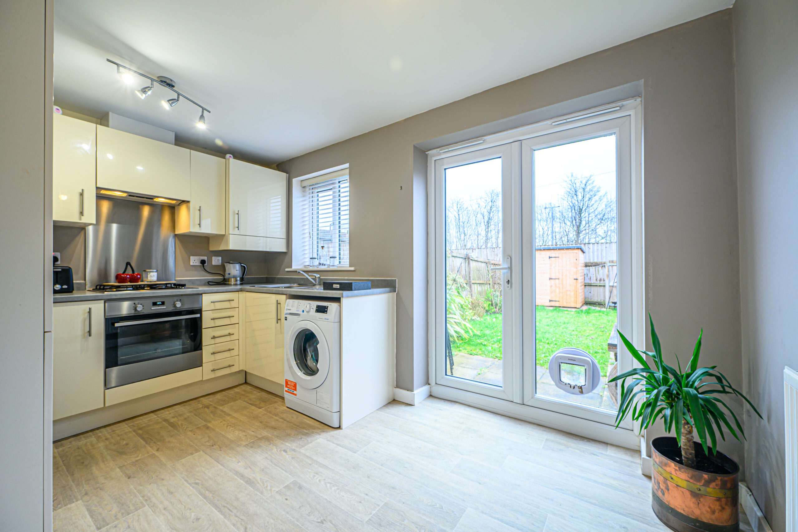A well-presented kitchen-diner offering ample storage and workspace, with French doors opening directly onto the south-facing rear garden—ideal for daily meals, casual dining, or entertaining family and friends.