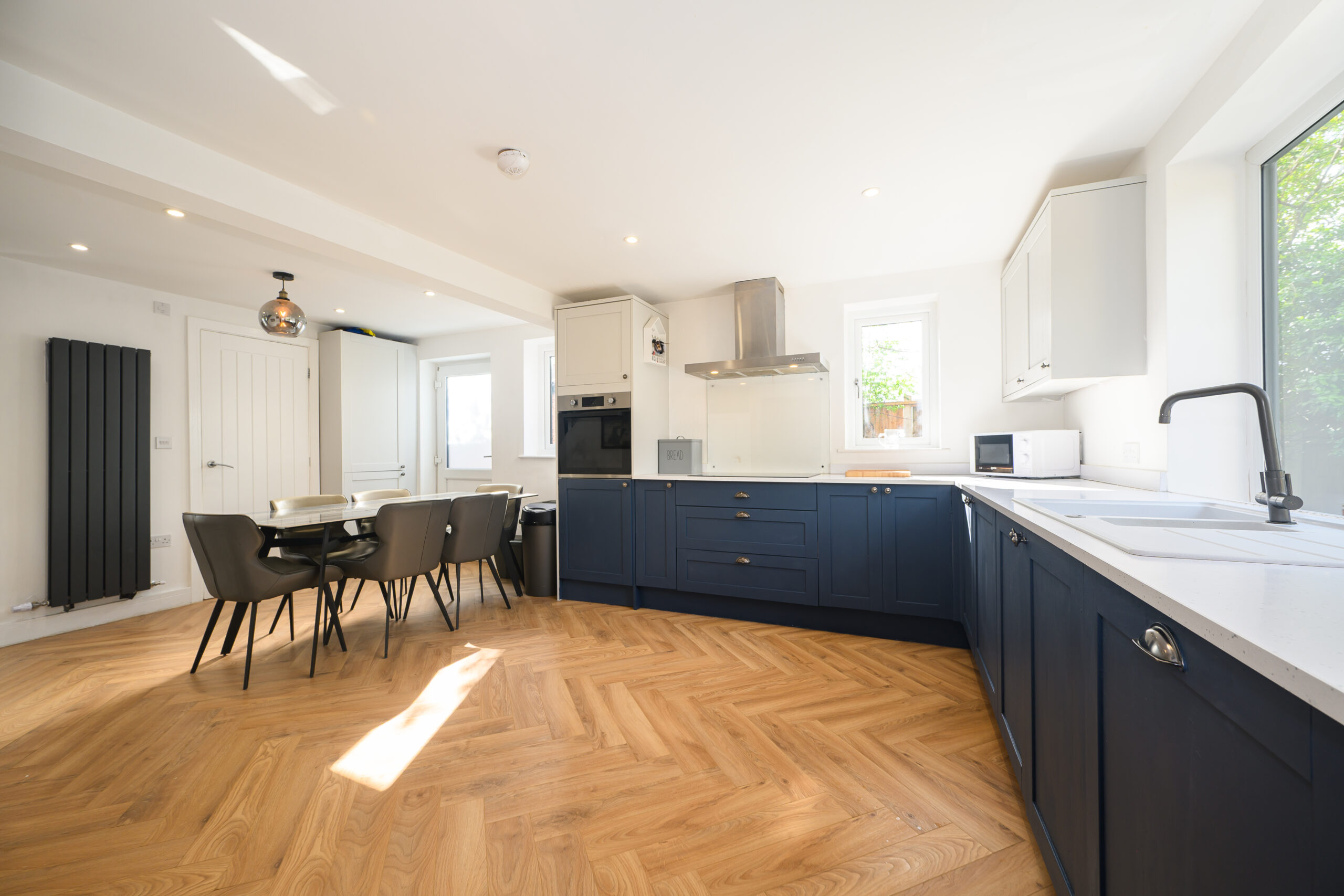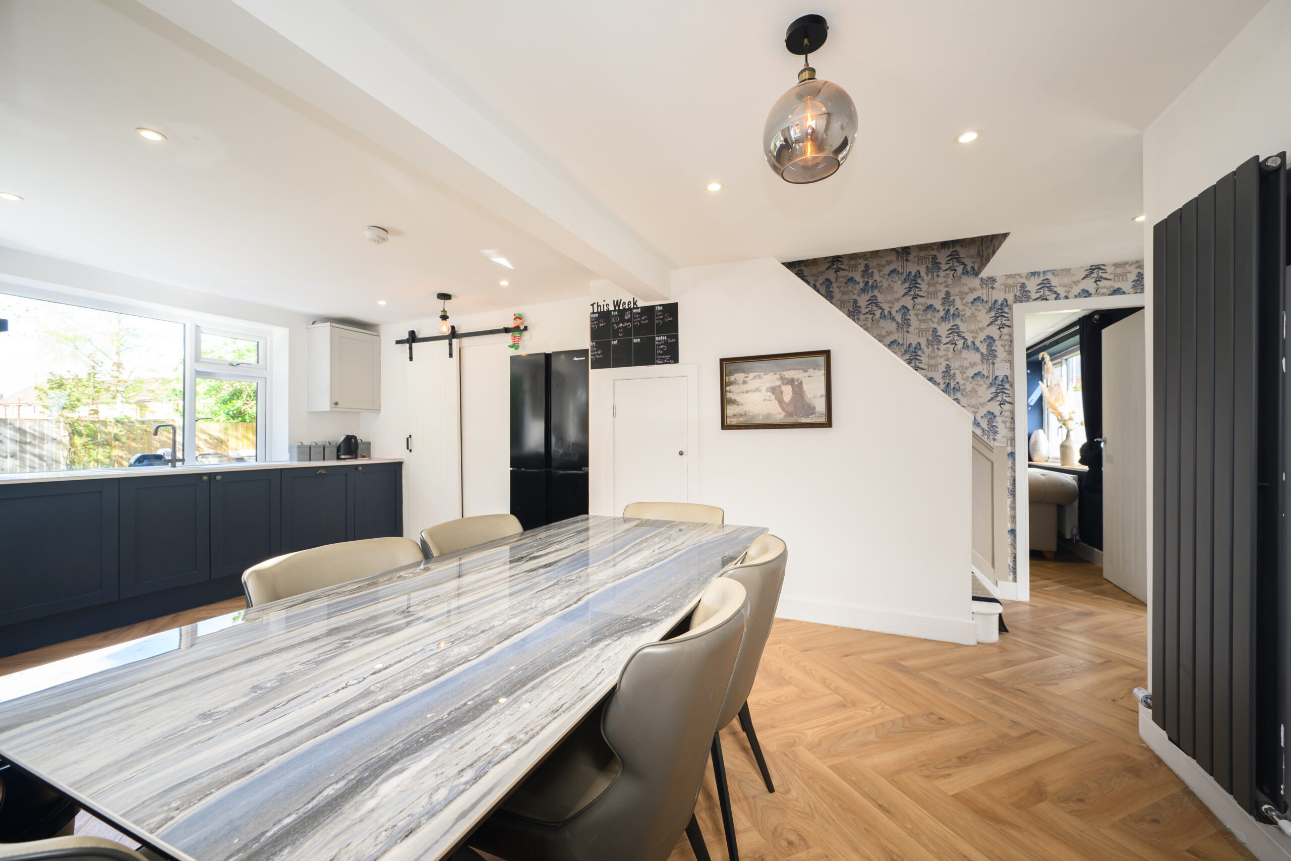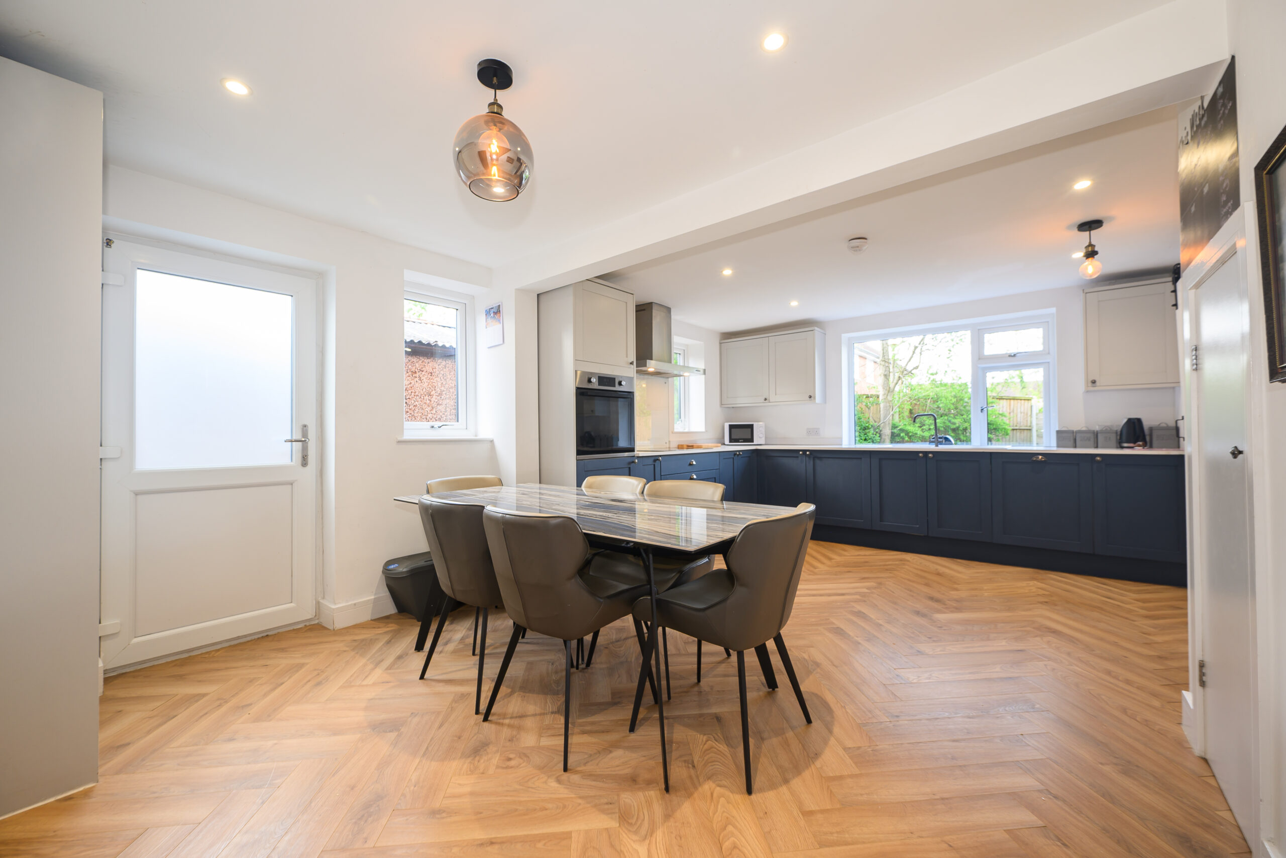 A stylish and contemporary kitchen with ample space for dining, ideal for family meals and social gatherings, with access through to additional utility and storage areas.